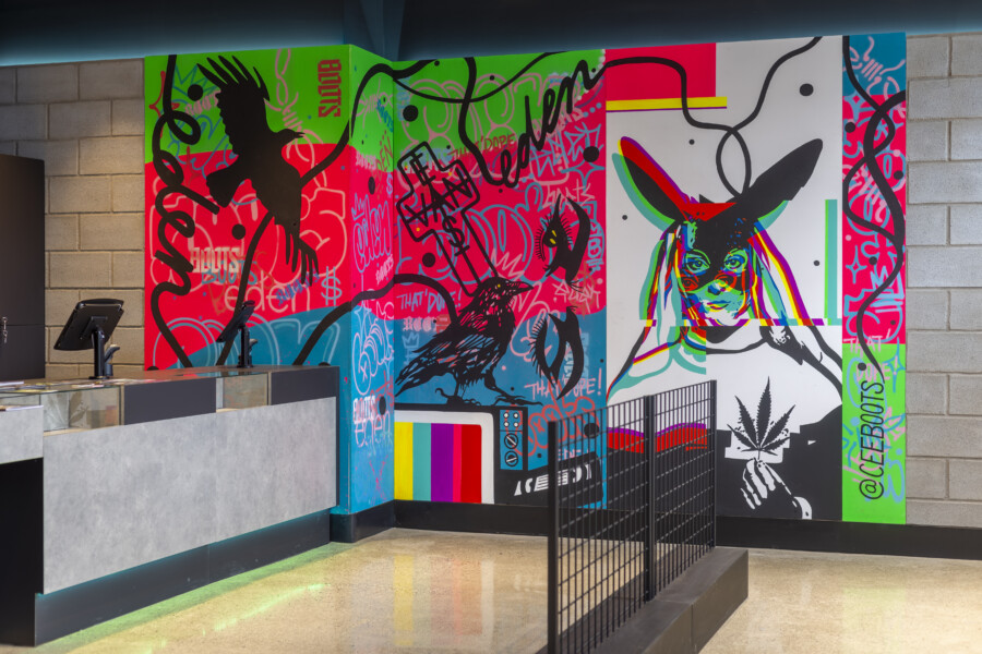 Architectural millwork, new interior and exterior doors/hardware, new steel stud / drywall wall layout, repair building envelope issues, polished concrete flooring, new paint, new electrical/lighting, new washroom accessories & flooring, custom mural by local artist, new faux cinderblock wall covering, merchandising display, new washroom fixtures, new security and sound system,